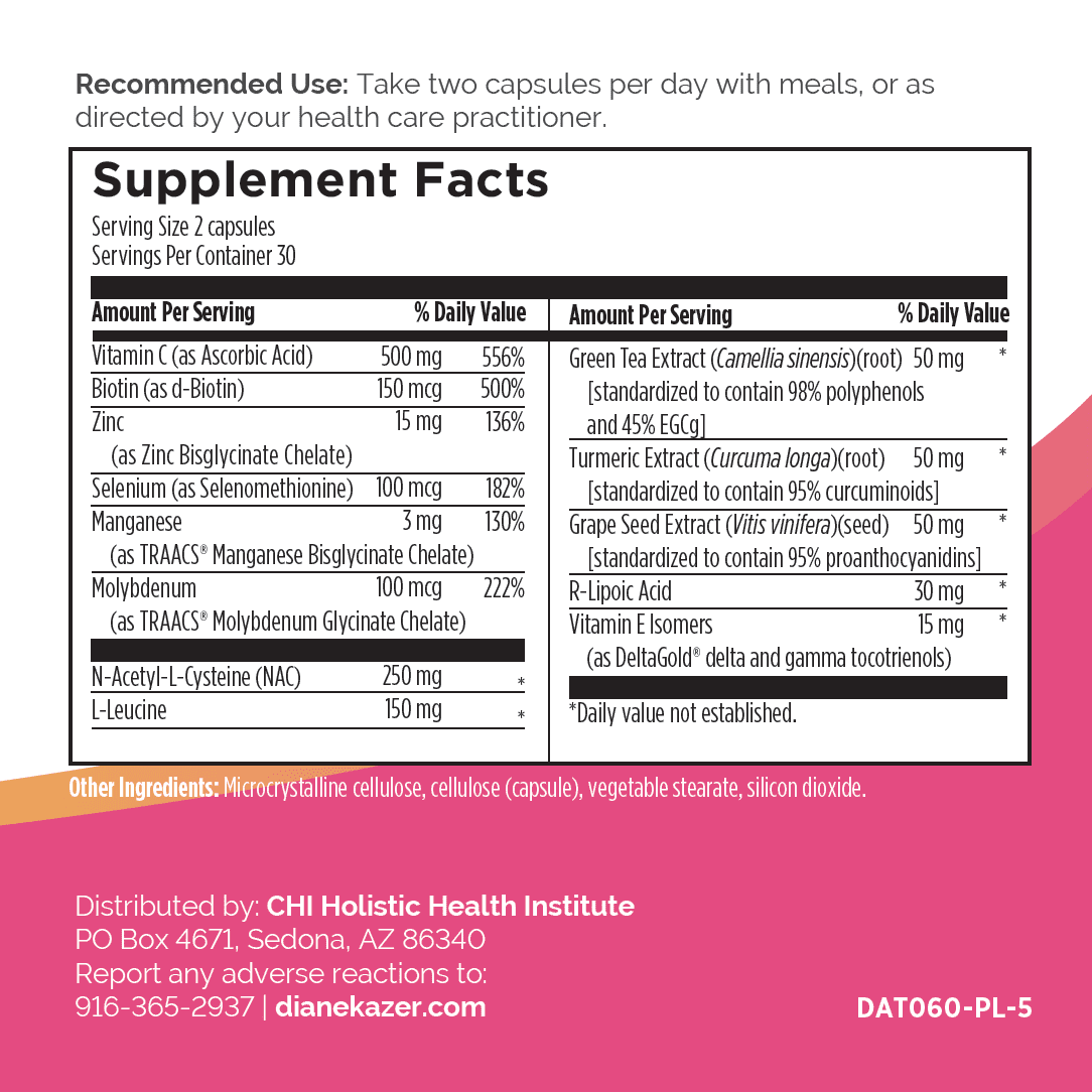 Detox Diva synergistically combines nutrients, herbal extracts and other compounds that have positive effects on the body’s detoxification processes. The ingredients in this product were selected for their ability to combat free radicals and help detoxify harmful substances including heavy metals. This formula contains multiple nutrients known to raise glutathione levels, making it helpful for supporting phase II liver detoxification.